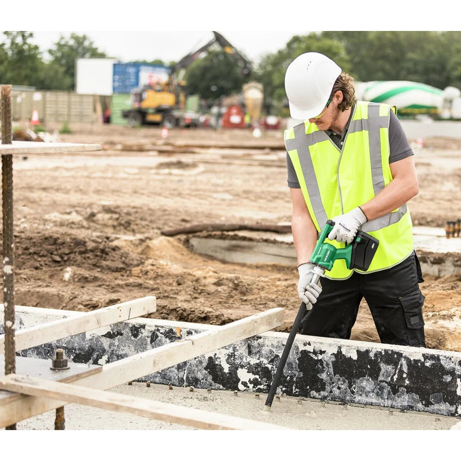 The Hikoki Cordless Concrete Vibrator UV3628DA for fast de-coating progress. The UV3628DA offers an operating time of up to 60 minutes per charge when used with the BSL36B18 battery. Furthermore, it features two modes – normal and power mode – allowing for ideal adaptation to specific work requirements. Additionally, the switch-on lock enables continuous operation without the need for constant switch actuation, reducing fatigue. Moreover, the tool and battery are protected against concrete ingress, which not only ensures a long tool life but also minimizes cleaning effort. FEATURES - Powerful brushless motor. - High vibration frequency. - More efficient elimination of air bubbles. - Two selectable speed modes. - Splash protection for battery and the switch. - Handle designed for convenient placement on a steel pipe/bar.